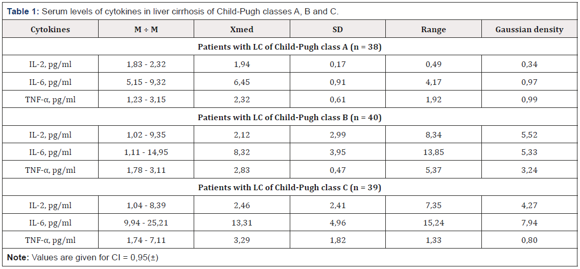 At present, influence of cytokines on the activation of the pathological process in the liver and impaired portal blood flow have not been sufficiently studied [3-6]. In addition, there are data on the activation of the cytokine cascade in liver cirrhosis. Increased levels of tumor necrosis factor alpha and interleukin-6 causes liver damage and correlate with the severity of liver cirrhosis [7,8]. Given the heterogeneity of data in the literature concerning the serum level of cytokines and their influence, studies of the mechanisms of pathogenesis and complications in liver cirrhosis in this direction should continue. At the same time, there are no clear data on the interrelations of functional indices of the liver and the serum cytokine levels in liver cirrhosis [9,10].