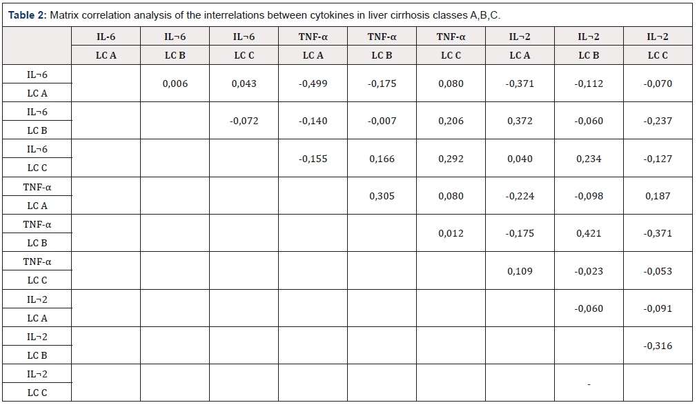 Matrix correlation analysis of the interrelationships between cytokines in liver cirrhosis classes A, B, C (Table 2), showed that the most significant correlation interrelations were observed between tumor necrosis factor α and interleukin 6 in case of class A LC (r = 0.499 ), tumor necrosis factor-α and interleukin-2 with class B LC (r = 0.421).