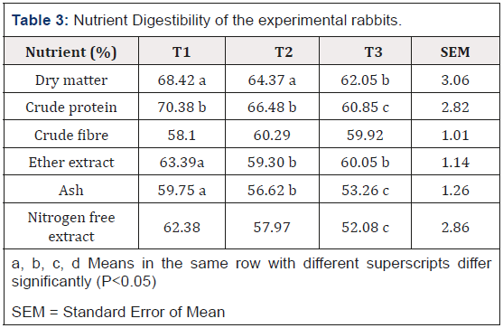 The results of proximate analyses of the concentrate, A. hybridus stem and F. thoningii is presented in (Table 2). Nutrient digestibility is shown in (Table 3). Dry matter (DM), crude protein (CP), ether extract (EE), Ash and Nitrogen free extract (NFE) were more digestible in animals on concentrate only than animals on concentrate and forages but crude fibre was more digestible in animals on concentrate and forages than those on concentrate only. Similarly, with the exception of ether extract, all other nutrients were more digestible in animals on A. hybridus than those on F. thoningii. This is an indication that A. hybridus stem is more digestible than F. thoningii. The reason may probably be due to some anti-nutritional factors present in F. thoningii. This is in time with the report of [6] who stated that a variety of anti-nutritional factors can affect digestion, reduce growth and affect body metabolism of animals. Digestibility of nutrients differ significantly (P<0.05) between the treatment groups. Results of feed intake, weight gains and feed conversion ratio are presented in (Table 4). Average daily feed intake (ADFI) of animals on concentrate diet only (T1) was 43.00 g with corresponding average weight gain (AWG) of 14.00 g. ADFI of animals fed concentrate and A. hybridus stem (T2) was 80.50 g with concentrate and A. hybridus consumption of 30.20 g and 50.30 g respectively to gain 17.14g. Similarly, ADFI of animals fed concentrate and F. thoningii (T3) was 65.50 g with concentrate and F. thoningii consumption of 30.00 g and 35.50 g respectively to gain 12.86 g. ADFI and AWG were better in animals on concentrate and A. hybridus stem than other groups. Feed conversion ratio was lower in T1 than T2 and T3. All the values obtained for all the parameters were significantly (P<0.05) different between the treatments. Although higher feed intake with corresponding higher gain were recorded in T2, feed was better converted to carcass in T3. However, T2 had higher gain and better conversion than T3. This could be due to higher CP, lower CF and succulent nature of A. hybridus stem compared to F. thoningii foliage. The observation is in line with the report of [1]. Higher CF in F. thoningii than in A. hybriduss stem may also be a factor that led to lower feed intake and lower digestibility in T3 than in T2. This observation is in line with report of [7] who reported reduced digestibility due to high levels of dietary fibre. This apart, the significantly lowest feed intake and weight gain of rabbits on T3 possibly suggests that F. thoningii may likely contain some anti-nutritional factors which must have affected its intake and utilization. The results of this study had indicated that rabbit can perform well when fed with concentrate diet supplemented with A. hybridus stem. This agrees with the conclusion of [8] who concluded that rabbits can perform well with mixed regime of forages and concentrate.