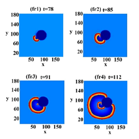 Rabinovitch et al. [11] model, based on the Morris Lecar system of equations, considers a theoretical ring (annulus) around which a single pulse of AP is rotating. The ring is surrounded by nonconducting region simulating fibrotic heart syncytium. At a certain time and position along the ring, the pulse becomes free to enter either the outside part and/or the inner part of the annulus. Results show that, in this case, partial target waves (PTW) are originated and there are basically two methods by which spirals can be originated, both depend on encounters of PTW arms; one being an encounter of an arm’s end with the core and the other is a mutual encounter of two different arms. In both encounters, a partial annihilation occurs at the contact.