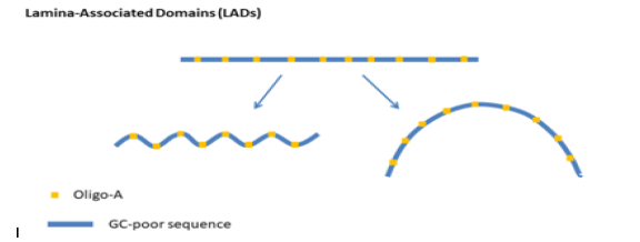 Figure 1: Schematic representation of the structural motifs of Lamina-Associated Domains (LADs). These are GC-poor genetic regions doped with oligo-A units. These units cause local curve or arc structures in the DNA.