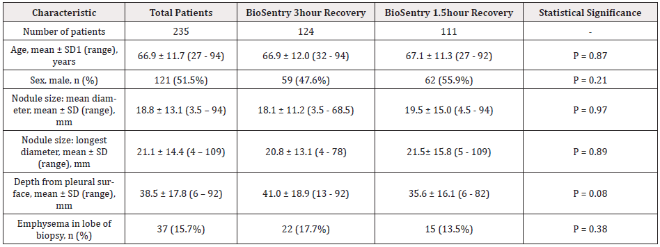 Table 1: Lung biopsy patient demographics, comparison of 3- versus 1.5-hour post-procedure recovery groups.