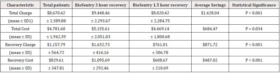 The costs and charges were compared between the 3- and 1.5-hour recovery groups, excluding chest tube placement patients (Figure 1). In this study, we mainly focused on costs for our analyses since it is likely a more accurate reflection of what is generally referred to as “health care costs” incurred to the society. The average total cost in the 1.5-hour recovery group was $4,469 (± 1,801) compared to $5,156 (± 2,051) in the 3-hour recovery group, resulting in average cost savings of $686 (P < 0.05) (Table 3). The recovery cost was decreased by $487 (P < 0.001) in the 1.5-hour group. The use of BioSentry did not add significantly to the overall cost of the procedure due to the use of c-code for billing approved by the Center for Medicare and Medicaid Services to offset the cost of the device, as well as institutionally negotiated price.