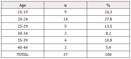 From April 2020 to January 2021, clinical and epidemiological data were collected from 37 pregnant women diagnosed with COVID-19 at the General Hospital “Dr. Agustín O´Horán ” of the SSY. The period prevalence of COVID-19 in pregnant women treated at the hospital was 2.8%. Of the total positive cases, 33 (89.2%) required hospitalization and 4 (10.8%) were ambulatory. The first positive case was confirmed on April 23, 2020, and the last was diagnosed on January 15, 2021. 13 (35.1%) women reported having had contact with a suspected COVID-19 case two weeks before falling ill. The most frequent ages of the women were in the group of 20-24 years with 14 (37.8%) cases; and the 15-19 yearsold with 9 (24.3%) cases (Table 1). 87% of the pregnant women had completed secondary school, 58% lived in common union and 94.6% were dedicated to housework. The cases came from 16/32 municipalities of the State and 59.5% of them were women referred from localities whose journey took between thirty and ninety minutes to reach the O’Horán hospital (Figure 1).