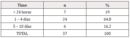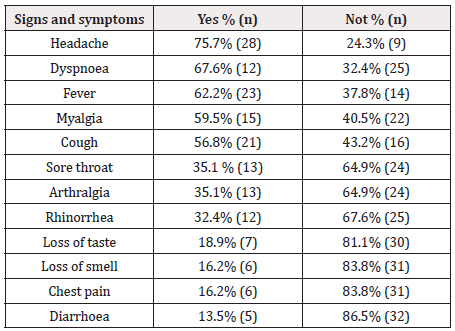 Of the 37 positive cases of pregnant women with COVID-19 studied, 30 (81.1%) were in the third trimester of pregnancy and most primiparous 20 (56.7%). 35 (97%) of the cases had prenatal control with at least five prenatal consultations. 24 (64.8%) sought help between the first and fourth day from the onset of symptoms (Table 2) In 14 (37.8%) women, the onset of the condition was sudden. The main signs and symptoms that COVID-19 positive pregnant women presented were headache 75.7%, dyspnea 67.6%, fever 62.2%, myalgia 59.5% and cough 56.8% (Table 3). Other less frequent signs and symptoms were attack of the general state and chills in 32.4% and 21.6%, respectively. Comorbidities were present in 13 (35.1%) cases, the main ones being asthma in 5 (39.0%) and arterial hypertension in 3 (23.0%) (Figure 2); in 2 (15.4%) cases there was more than one comorbidity. The average number of days elapsed between the onset of symptoms and admission to the hospital was 2.8 ± 2.4 days. The average days of hospital stay was 5.2 ± 3.9 days. The average number of days that the entire illness lasted was 10.8 ± 8.8 days. Regarding the treatment of the cases, 10 (27.0%) received antimicrobial treatment, 9 (24.3%) anticoagulant, 3 (8.1%) corticosteroid and 1 (2.7%) hydroxychloroquine. 17% of the cases required supportive oxygen and 1 (2.7%) required mechanical ventilation. 23 (63%) had lymphopenia and 36 (97%) with a D-dimer greater than 1. No deaths occurred in the women studied.