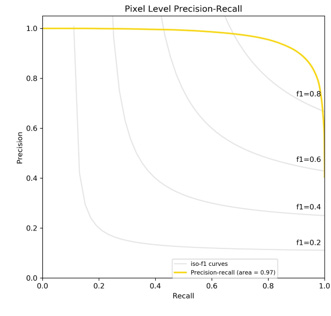 If the number of predicted positive pixels exceeded 0.5% of the total pixels of an image, we would classify the image as positive for basal cell carcinoma. We obtained 96% accuracy of the slide level classification. Specifically, 65/65 images with basal cell carcinoma were correctly detected (100% sensitivity) and 55/60 tumor-free images were correctly classified with 91.7% specificity. Furthermore, because the segmentation task was essentially a pixel level classification task, we provided pixel level classification analysis in this study. We mainly analyzed the model by ROC and PR curves. As shown in Figure 2, our model generated a near-perfect ROC curve with AUC= 0.99. (Figure 3) showed a PR curve of our model with ISO-F1 curve on the top. The PR curve described the trade-off between the positive predicted value (precision) and true positive rate (recall) of a binary classification using different probability threshold. Similarly, we obtained 0.97 AUC for the PR curve despite that PR curve was a relatively stringent measure for the classification task.