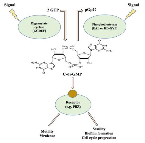 The intracellular levels of c-di-GMP are regulated by the antagonistic activity of diguanylate cyclases (DGCs) and phosphodiesterases (PDEs) enzymes that catalyze the synthesis and hydrolysis of this molecule [62]. Cyclic di-GMP is synthesized from two molecules of GTP by DGCs and degraded into 5′-phosphoguanylyl-(3′-5′)-guanosine (pGpG) or to two molecules of GMP by PDEs [63]. Diguanylate cyclases share a conserved domain containing the amino acid motif GGDEF, whereas PDEs include one of two conserved domain families: one defined by the EAL motif and the other by an HD-GYP motif [64]. High levels of c-di-GMP are found to be associated with the adhesion to surfaces, production of EPS, and formation of bacterial biofilm or a sessile lifestyle, whereas low levels can increase bacterial motility, promote biofilm disassembly and lead to the activation of virulence pathways [62,63,65].