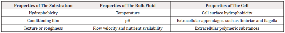 Table 1: Important variables in bacterial cell attachment and biofilm formation.