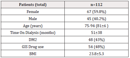 Clinically stable geriatric hemodialysis patients (older than 75 years old) who were dialysis outpatients were included in this crosssectional study. Diabetes mellitus (43%) and hypertension (37%) were the two primary causes of ESRD. Characteristics of the study population are shown in Table 1. A total of 112 patients responded to the questionnaire (67 females and 45 males). A nephrologist conducted face-to- face interviews with patients. The median age of participants was 81 years (81±6; range 75-94). The prevalence of diabetes mellitus type 2 corresponds to 43% of the total patients. Time on dialysis was 51±38 months. Fifty-four patients were using gastrointestinal system drugs (48%). Average body mass index of the patients was 23.8±5.3 (ranging between 19.2-29.8).