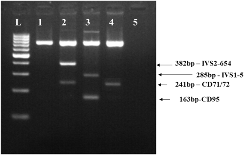 Figure 1: Gel electrophoresis analysis of CD71/72 (+A) mutation in the patient’s husband by multiplex ARMS PCR.