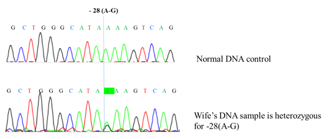 Nine common mutations in the Vietnamese population were screening for both the husband and wife. Multiplex ARMS-PCR result shows that the husband has codon 71/72 [+A] (Figure 1). The wife has never had a blood transfusion up to now. However, the genetic screening results clearly show that she has compound heterozygous for 28 [A>G] and codon 26 [G>A] HbE (Figure 2 & 3). These results were confirmed by Sanger sequencing (Figure 4-6). In general, β-thalassemia intermedia encompasses a broad clinical spectrum with more severe cases presenting between 2 and 6 years of age, including anemia, spleen, and sometimes liver enlargement, as well as delayed growth and development [3]. In other cases, patients are entirely asymptomatic until adult life with only mild anemia [4]. Because the clinical manifestations are not significant, the screening and diagnosis of patients with β-thalassemia intermedia are easy to miss. If only based on the initial screening results of the complete blood count, it is easy to make indecision that this patient is a β-thalassemia carrier. Particularly, if based on the hemoglobin electrophoresis analysis with the high level of HbF (8%), it recommends differential diagnosis. After finding the mutation of the father and the mother, we continued to find the mutant genotype of their children. The β-globin mutation was found in their children (Figure 7). This result shows that two children in this family both have β-thalassemia major. Importantly, they have two different genotypes because the mother is a compound heterozygous of two mutations.