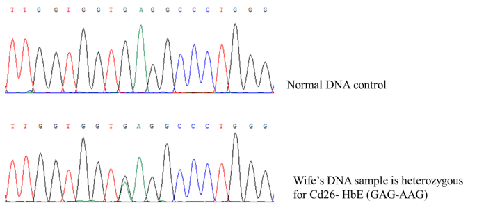 An unrelated couple in the Vietnamese Kinh group was admitted to the Human Genetics Department, National Children’s Hospital, for genetic counseling for thalassemia. They have two children who have been identified as β-thalassemia major who need treatment and regular blood transfusions. Based on laboratory findings, including complete blood count and hemoglobin electrophoresis (Table 1), this couple is highly likely to be β-thalassemia carriers. DNA testing for mutations in the Hbb gene is indicated for both husband and wife to confirm the diagnosis. They are assigned to test for 09 common mutations in the β-globin gene including: -28 [A>G], codon 17 [A>T], codon 26 [G>A] HbE, IVS 1.1 [G>T], IVS 1.5 [G>C], codon 41/42 [-TTCT], codon 71/72 [+A], codon 95 [+A], IVS 2.654 [C>T] by multiplex ARMS PCR. Sanger sequencing was then performed to confirm. According to the manufacturer, amplification products generated by PCR were purified using PureLink™ PCR Purification Kit (Invitrogen) and were cycle sequenced using Big Dye v3.1 reagents (Applied Biosystems) protocol. Sequencing products were purified with BigDye XTerminator™ Purification Kit (Applied Biosystems) and automated sequencing performed by capillary electrophoresis on an ABI3500Dx (Applied Biosystems). Sequences were aligned and examined by using Chromas Pro software (Technelysium Pty Ltd).