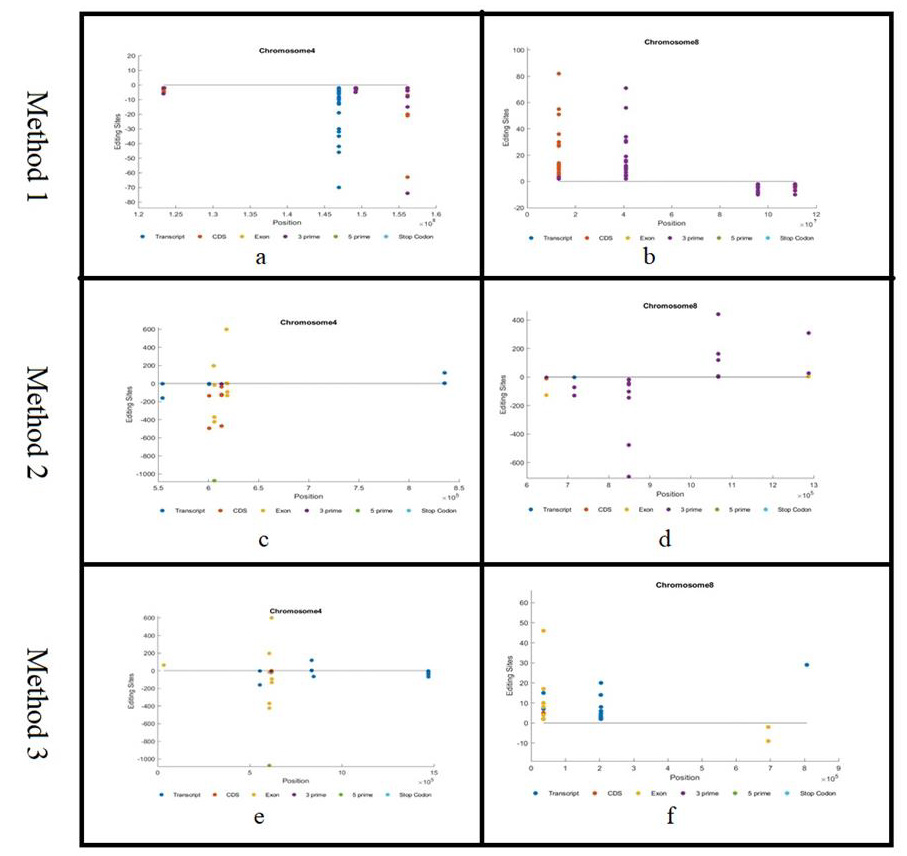 As examples of the distribution of editing sites in each chromosome using method 2, we provided a representation of chromosomes 4 and 8. Figure 3d shows the distribution of editing sites in chromosome 8. The x-axis represents the region, and the y-axis represents the count of the editing sites. From this figure, we can notice that the editing sites are in the forward and reverse directions. Positive direction of y-axis reflects the forward strand, and the negative direction reflects the reverse strand. It is apparently clear that the distribution of editing sites in this figure is different since we consider different set of genes. Most of the editing sites are in the 3 prime regions.