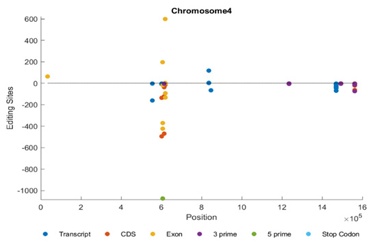 Figure 3a shows the distribution of editing sites in chromosome 4. We can notice that the editing sites are distributed among the transcript, CDS and 3’ regions. We can also notice that all of them are in the reverse strand.