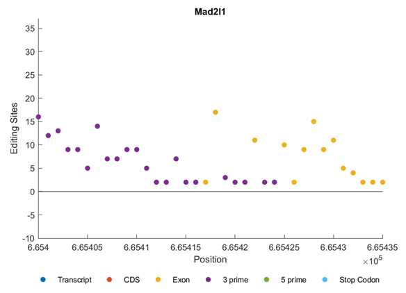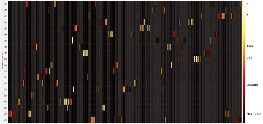 Figure 5 shows the distribution of editing sites across all genes and regions. X-axis represents the relative positions in the genome and y-axis represents the chromosomes. Different colours reflect different types including, transcript, CDS, exon, 3’, 5’, and stop codon. Most of the editing sites are in the 3’ region (yellow color). This figure provides a complete visualization of the distribution of editing sites across all chromosomes (Figure 5).