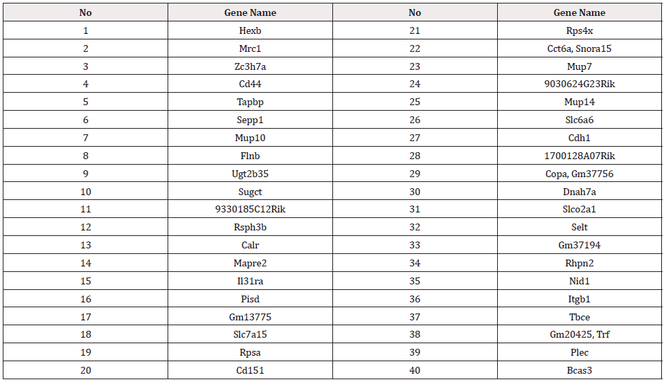 The top ranked 40 genes according to method 1 are shown in Table 1.