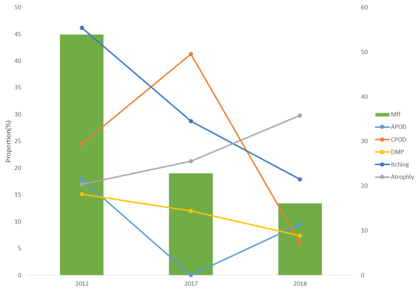 (Figure 3) Illustrates the proportion of clinical disease and mf during the three years follow up. The mf proportion when compared with the baseline and the subsequent follow up 2017 and 2018, there was a reduction from 48% to <20 % and 12%. whereas APOD at baseline was 17% and the 2017 follow up was <1%, however, in 2018 the APOD rates increased to 19%. On the other hand, atrophy was increasing, at baseline (2012) was 15% whereas 2017 increased to 17% and (2018) at 28%. CPOD at baseline (2012) was 22% and the second follow up (2017) increased to almost double 40% although in the last follow up, there was a large proportion of 32% reduction in CPOD conditions. The proportion of DPM was maintained only a big change was observed during the last follow up 2018 from 12% to 8%, there was a change in proportion of people presenting itching as compared to baseline 2012 (46%) and the last follow up 2018 (12%) (Figure 3).