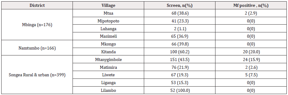 On the other hand, at Kitanda and Mtanygimbole the levels of infection (O. volvulus.) was higher as compared to the other villages raises the concern that, the parasite populations particularly their maturity (age) and the fecundity SlwSlow vnomic DNA levels indicating that they had micro-sub clinical O. volvulus infection. On the other hand, they did not present dermal mff or visible clinical signs or symptoms a feature of low transmission in the area. This was also the reason why study design was changed during the analysis [41-45].
