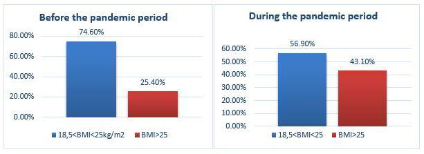 The majority of children had an active physical lifestyle prior before pandemic period with a rate of 62.3%. In addition, the proportion of children considered physically inactive was 37.7% before quarantine (Figure 4). In contrast, during the pandemic period 86% dramatically decreased their physical activities, and only 13.8% were able to maintain a good physical activity adapted to such conditions. As a result, sedentary behaviors such as screen exposure, daytime sleep, and dietary overconsumption increased during the period of social isolation with a rate of 73.8%. Therefore, the proportion of children considered obese or overweight increased from 25.4% before the pandemic period to 43.1% during the evaluated period (Figure 5).