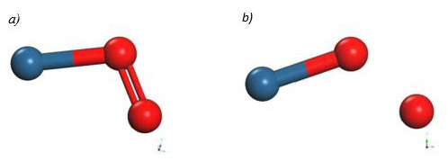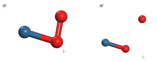 Finally, the optimized Pt + O2 system is taken again, by fixing platinum and oxygen atoms, and the other oxygen atom is moved away diagonally until the energy calculated is constant (Figure 13). For each distance, an energy value is obtained as shown in Table 5.