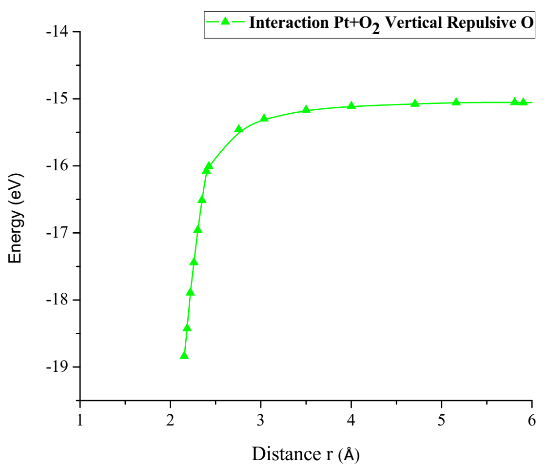 In Figure 15 it is found that the inflection points, vertical repulsive oxygen (vrH) = 3.783Å, diagonal repulsive oxygen (drH) = 3.638Å, horizontal repulsive hydrogen (hrH) = 3.757Å, consequently it is found that drH breaks before hrH and this before vrH. And with energies vrH = 3.783eV, drH = 3.638eV, hrH = 3.757eV, these correspond to what it takes on average almost the same amount of energy to dissociate a Pt-O bond. This agrees with potential energy well depth of the Pt-O interaction calculated previously.