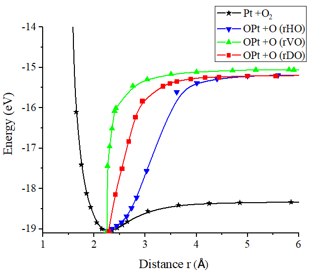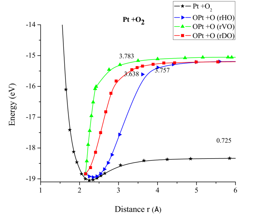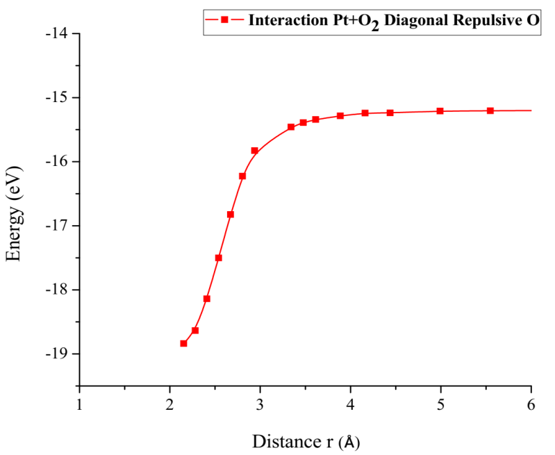 Comparing the energy of the potential well of the Pt-O interaction, which is 3.745eV in our simulation, and the experimental value of 3.82eV [18] there is an error of 1.4%.