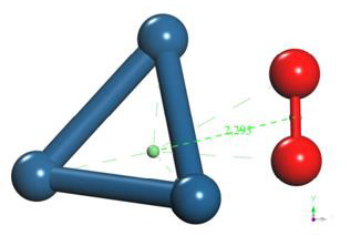 The geometry optimization calculation of the platinum cluster is accomplished with the oxygen molecule. A the input, the platinum cluster is placed at a distance of 4.176Å from the oxygen molecule to carry out the optimization (Figure 17).