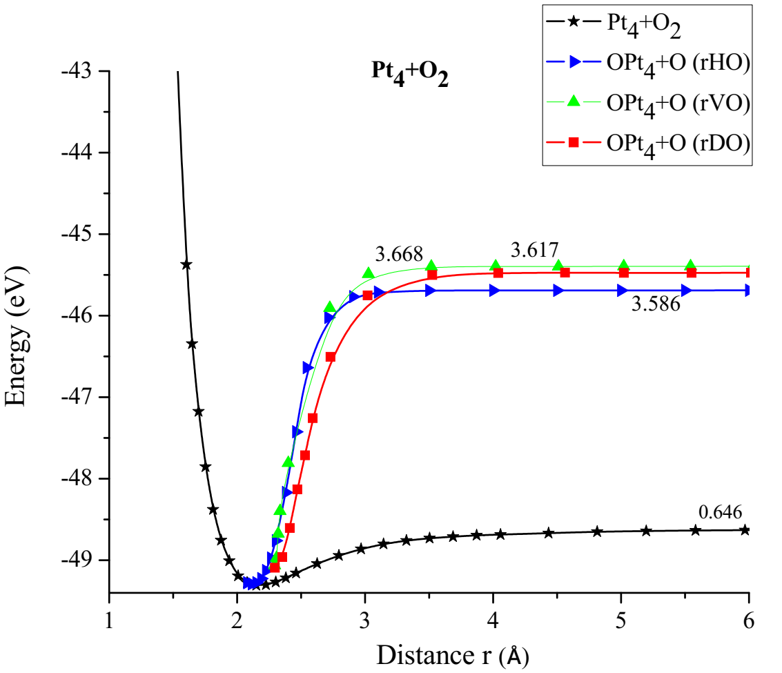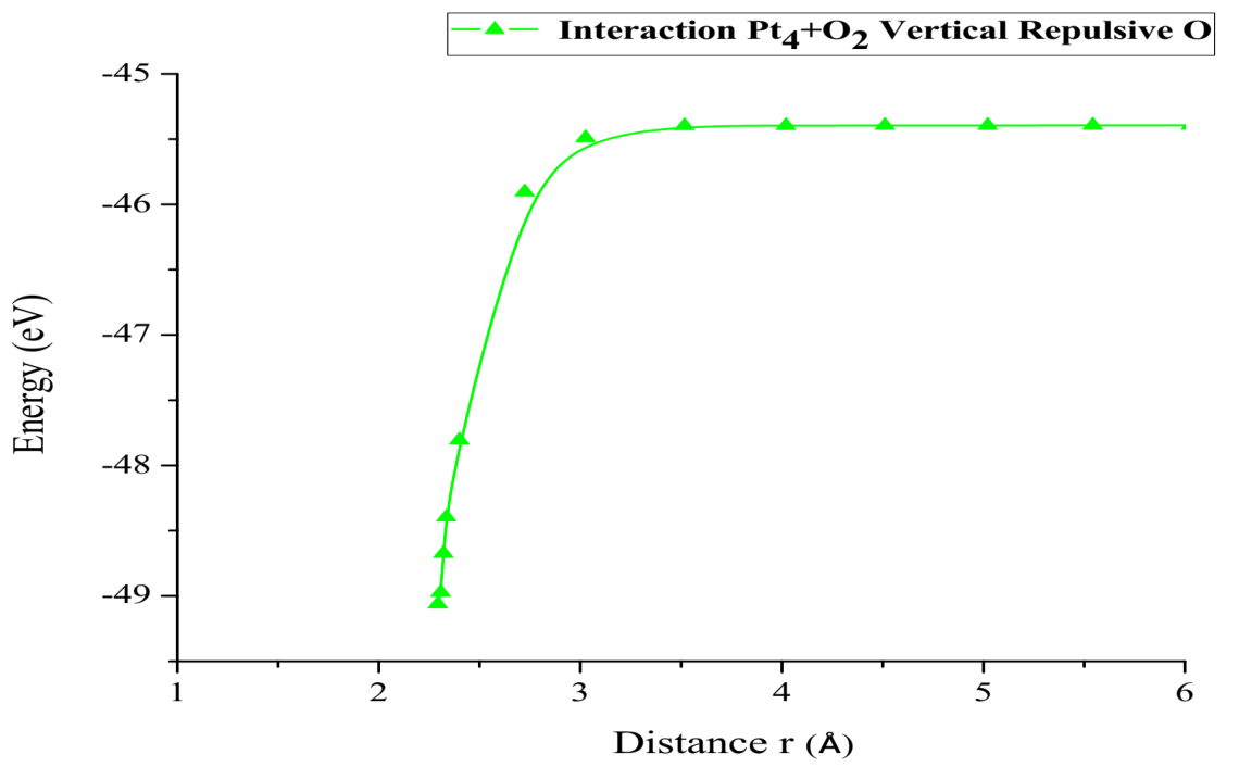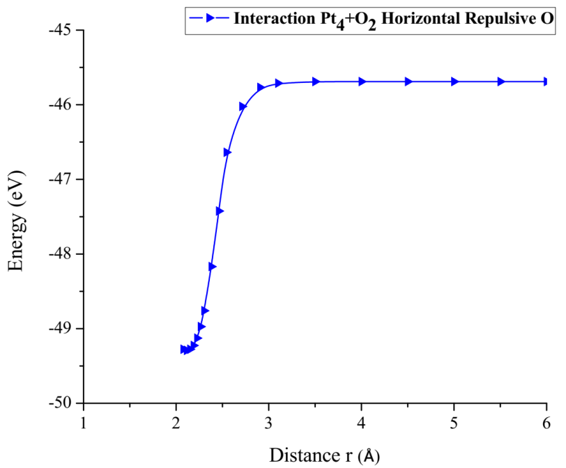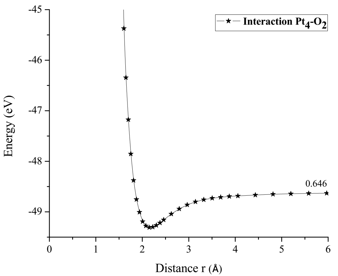 The Pt4O2 complex formed at the minimum of the potential energy curve is broken by taking out one oxygen atom to free it, to obtain Pt4O + O as products. The Pt4O2 complex molecule has an equilibrium distance of 2.295Å between Pt4 and O2, and an equilibrium energy of -49.092eV with an energy well depth 0.646eV potential as shown in Figure 19. The output after geometry optimization gives 1.3Å for O-O bond length,