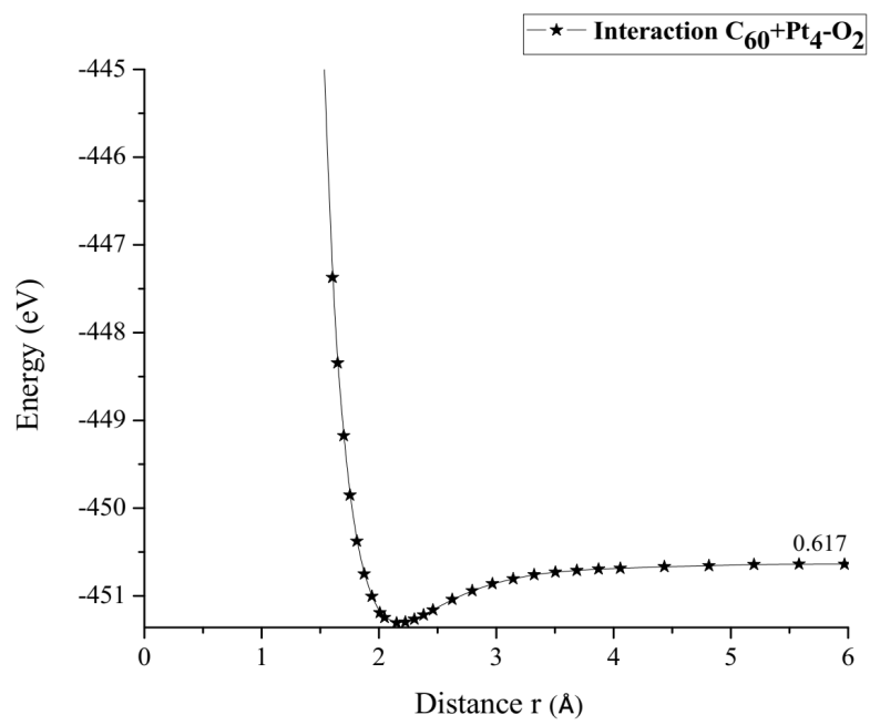 The C60Pt4-O2 system is carried out to break the oxygen molecule, for obtaining C60Pt4O + O products. Having Started with C60Pt4-O2 system already geometrically optimized (Figure 28), which has an equilibrium distance of 2.048Å between C60Pt4-O2 and an equilibrium energy -451.2475eV with a potential energy well depth of 0.617eV.