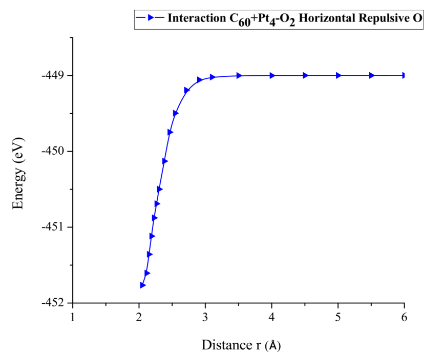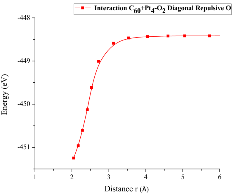 From the already optimized system we fixed the C60Pt4 system and an oxygen atom, later the non-fixed oxygen atom is moved away horizontally until the energy is constant. At each distance, the corresponding energy value is obtained, as shown in Table 11 (Figure 30).