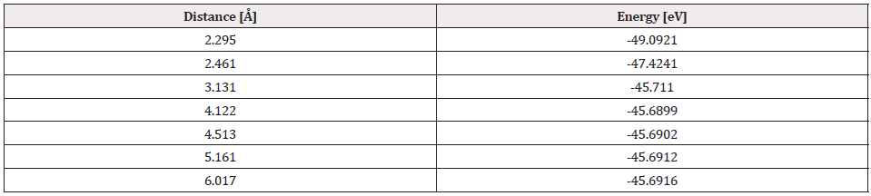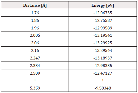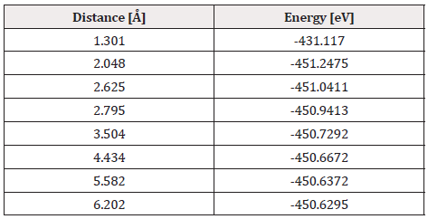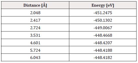 The output result of the geometry optimization produced an equilibrium distance of 2.06 Å (Figure 2) and an equilibrium energy of -13.2992 eV.