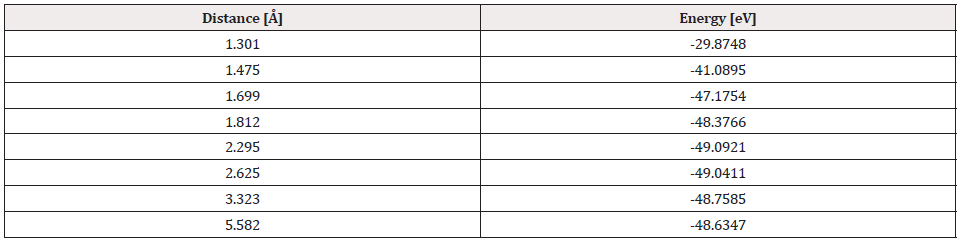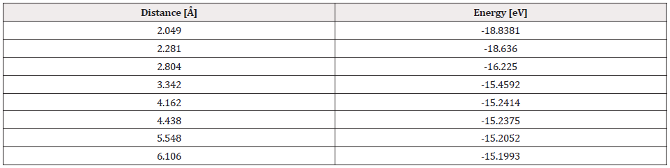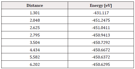 The potential energy well of the Pt-O2 interaction is calculated as shown in Figure 8. Where the platinum atom is fixed, and the oxygen molecule is moved away and closer from 0.1Å to 0.1Å. At each distance, an energy value is obtained as shown in Table 2, for which a potential well size of 0.725eV has been determined. The experimental value of this interaction is equivalent to 0.719eV [19]. Then, the approximation error is 1% between the calculated and experimental value (Figure 8).