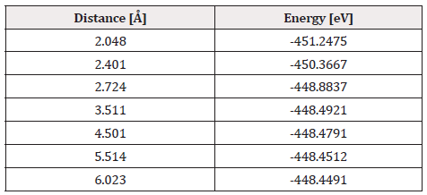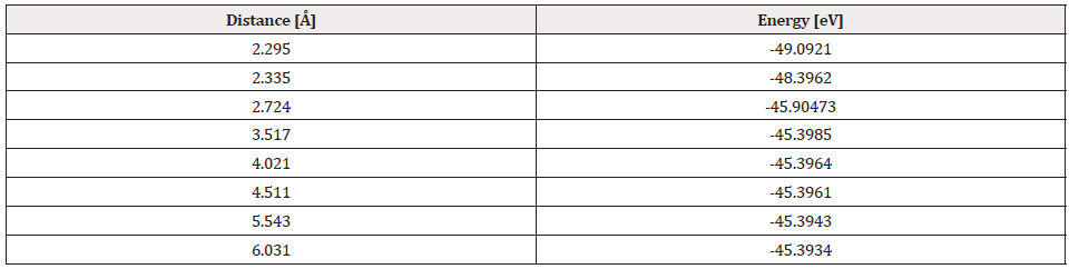 From the already optimized system we fixed two atoms, the platinum atom, and the oxygen atom, later an oxygen atom is moved away due to it is not fixed. It is moved horizontally until the energy is constant. For each distance, an energy value is obtained as shown in Table 3 (Figure 8).