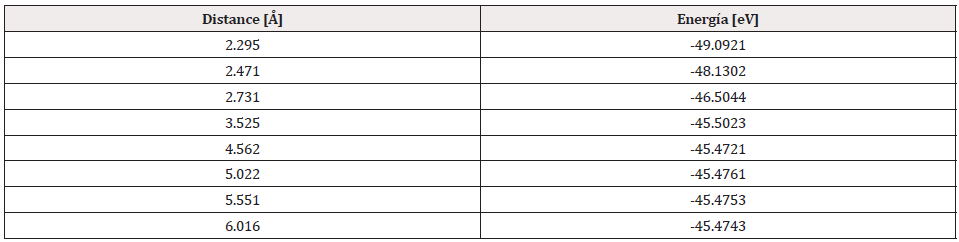 The potential energy well of the C60Pt4-O2 interaction is calculated as shown in Figure 29, and for this the C60Pt4 system is set fixed, and the oxygen molecule is moved away and closer from 0.1Å to 0.1Å. At each distance, the corresponding energy value is obtained as shown in Table 10, for which a potential well size of 0.617eV is obtained, the experimental value of the interaction is equivalent to 0.619eV [19] there is an error of 0.3%, then the agreement is very good.