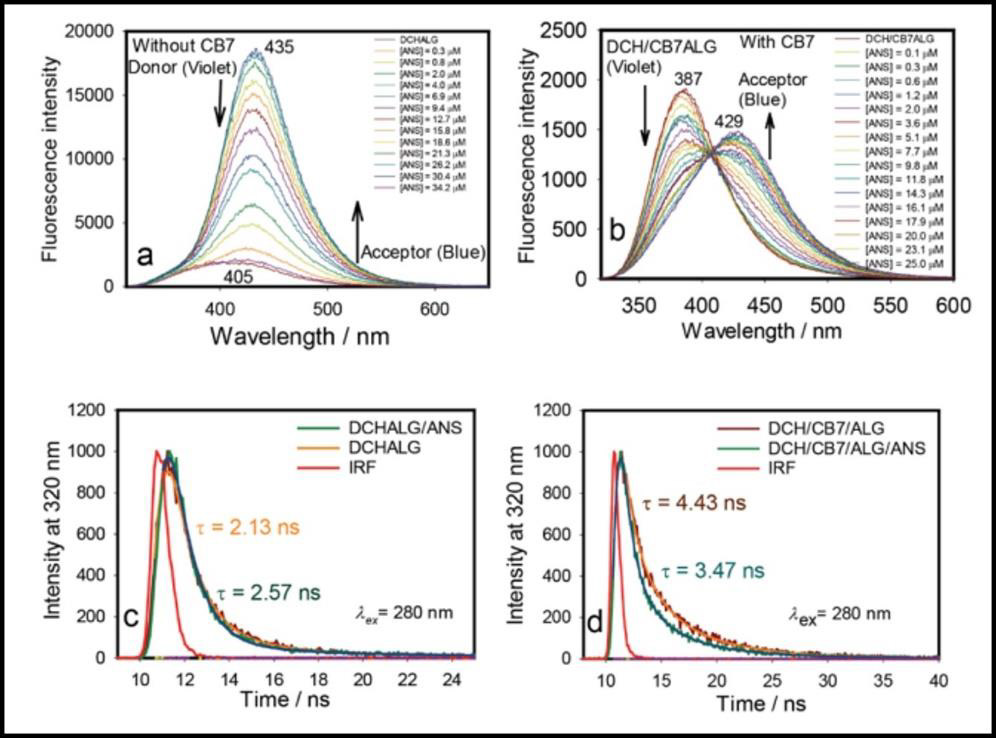 Figure 2: At various concentrations, energy transfer from (a) DCHALG (1.5 mg L-1 aqueous suspension) and (b) DCH/CB7ALG (2.75 mg mL-1 aqueous suspension) to ANS. Corresponding 320 nm emission decays indicated by the estimated average excited-state lifetime in the absence and presence of CB7 (c) and (d).