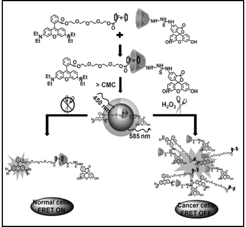 Wang and colleagues demonstrate in their research a supramolecular fluorescent nanoparticle retying on FRET for detection of hydrogen peroxide (H2O2) in cancer infected cells [37]. Utilizing the FRET signal, a Supramolecular fluorescent nanoparticle self-assembled from fluorescein isothiocyanate modified β-cyclodextrin (FITC-β-CD)/Rhodamine B Modified Ferrocene (Fc-RB) amphiphile were employed for H2O2 detection in cancer cells as depicted in Figure 4. The self-assembled nanoparticles based on numerous non-covalent contacts in aqueous medium demonstrated great sensitivity to H2O2 while being stable under physiological conditions. The addition of H2O2 resulted in a noticeable fluorescence shift of nanoparticles from Red (RB) to Green (FITC) in fluorescent tests due to the Fluorescence Resonance Energy Transfer (FRET) phenomenon. Furthermore, in vitro results clearly indicate that fluorescent nanoparticles may be effectively absorbed by cancer cells and then destroyed by endogenous H2O2, accompanied by FRET from “on” to “off.” These supramolecular fluorescent nanoparticles, which were created through a series of non-covalent interactions, are likely to have applications in the diagnosis and imaging of illnesses induced by oxidative stress.