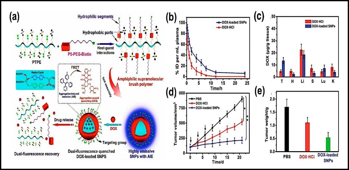 Because of the additional negative membrane potential of mitochondria, it may be identified by the [2] rotaxane via electrostatic interactions and lighted up because of the recognition. Based on the above foundation, they started to create FRET-capable SNPs for DOX delivery that were constructed using pillar [5] arenebased amphyphilic Supramolecular Brush Copolymers (SBPs)29 TPE and 4,4′-bipyridinium derivative (M) moieties were alternately implanted onto the polymer. The host-guest interactions formed between the M entities and PEG-Biotin (targeting group), as illustrated in Figure 5a, functionalized P5. As a result, SBPs were produced and then self-assembled into SNPs, which displayed an AIE effect caused by the aggregation of TPE units in the particles’ center. The system’s emission decreased when DOX was encapsulated in the SNPs because to the FRET from TPE to DOX and the ACQ of the DOX units, resulting in dual-fluorescence quenching.