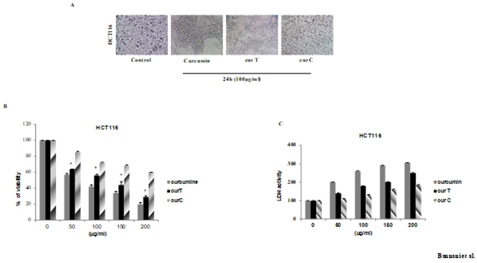 Figure 1: Effects of cur T, cur C and Curcumin on cell morphology and growth in HCT116. (A) HCT116 cells were seeded all night and day and latert reated with100μg/ml of spices for 24h. Cell shrinkage and cell detachment were observed (B) Effect of spices on proliferation on HCT116 cell line by MTT assay. Cells were treated witch cur T and cur C at the indicated conditions The inhibition of cell proliferation was in a dose dependent manner (C) Effect of spices on the release of LDH in HCT116 cells. The cells were seeded in 96-well culture plates and treated the day after with cur T and cur C and the medium was collected after 48h of treatment with the indicated concentrations of spices. Light absorptions were analyzed at 340 nm using Tecan infinite M200 spectrophotometer. Data are expressed as means ± standard error of mean, n = 3. *Indicates a significant difference (p < 0.05) from Curcumin, cur T and cur C.