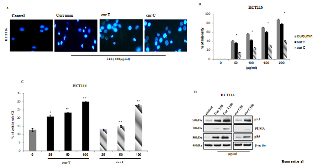 Figure 2: Induction of apoptosis in HCT116 cells by spices treatment.(A) Nuclei of HCT116 cells have been stained with fluorescent DNA-binding dye (Hoechst 33342)and analyzed under fluorescence microscopy using automated analytical software. The detected intensity is represented in the graph. (B) Data are expressed as means ± standard error of mean, *Indicates a significant difference (p < 0.05) from control. cur T, cur C and Curcumin. The DNA contents of the cells after the treatment with spices for 24h were evaluated by FACS analysis using propidium iodide staining. Representative data from the cell cycle analyses are shown. The percentage of sub-G1 phase cells from three different FACS analyses were calculated and presented as the mean ± standard error of the mean. *P<0.05. (C) Equal amounts of the proteins extracted from SCE treated cells were subjected to western blot analysis for detection of apoptotic signaling molecules, including p53, PUMA and p85. (D)