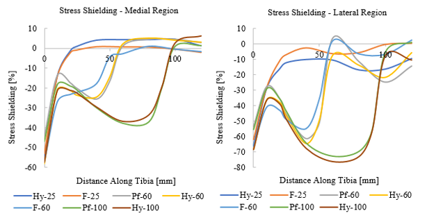 Figure 4: Stress shielding along tibia in the medial and lateral regions for varied stem lengths and fixation techniques.
