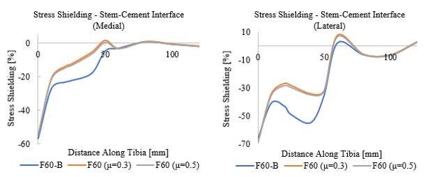The bonded interface consistently exhibited more stress shielding throughout the tibia, whereas the sliding friction condition (unbonded) exhibited lower but nearly identical levels of stress shielding. As shown in (Figures 9 & 10), there was an up to 20% difference in stress shielding between the bonded and sliding interface conditions in the 20 to 50-millmeter region. The stress shielding at the stem tip was higher for the bonded cases, whereas the bending stresses within the stem were lower for the sliding friction cases.