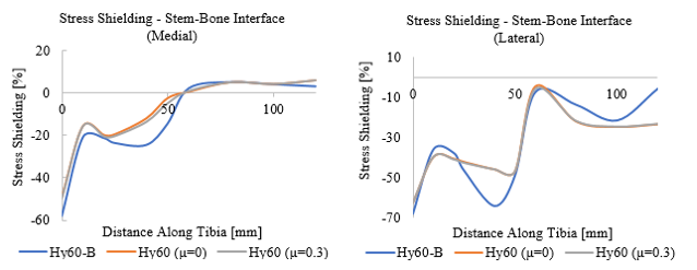 Figure 9: Stress shielding along tibia in the medial and lateral regions for varied stem-cement interface conditions.