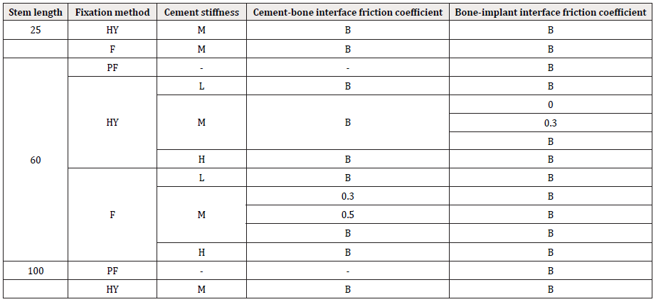Table 1: Combination of design parameters for different TKA configurations (HY - Hybrid, F - Full, PF – Press fit, L – low, M – medium, H – high, B – bonded).