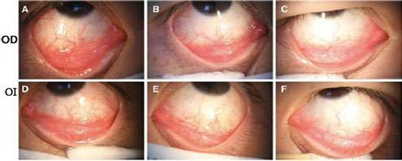 Note*: A and D: Condition with moderate conjunctival injection. Eyelid follicles. B and E: Significant clinical evolution 17 days after infection. C and