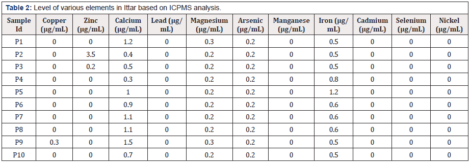 Based on ICPMS analysis for major heavy and trace elements in the Ittar samples (Table 2) it was found that majority of the elements were either completely absent or present in trace level. Copper, lead, manganese, cadmium, selenium and nickel were found to be completely absent in all the Ittar samples. Zinc metal was not found in any Ittar samples except in Ittar P2 and P4 samples. Calcium, magnesium and iron were found to be present by less than 1.5 PPM (Table 2). No major toxic elements such as arsenic, beryllium, cadmium, lead and mercury were detected at PPM levels in all the perfumes.