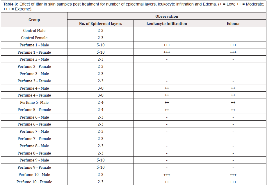 Histological findings showed a normal pattern of skin epidermal and dermal layers with mild or no infiltration of inflammatory cells in control group of animals. Perfume treated animals showed mild to massive changes in both epidermal and dermal layers characterized by intense infiltration of inflammatory cells, hyperplasia, and presence of enlarged and vacuolated cells, hyperchromasia and edema formation (Figure 4 & Table 3). Extreme infiltration of inflammatory cells was observed in Ittar P4 and P5 treated skin, followed by P7 and P9 samples. Large vacuolated cells were found to be present in skin treated with Ittar P5 and P8 samples (Figure 4 & Table 3). The physiological structure of the skin was compared against the untreated control samples.