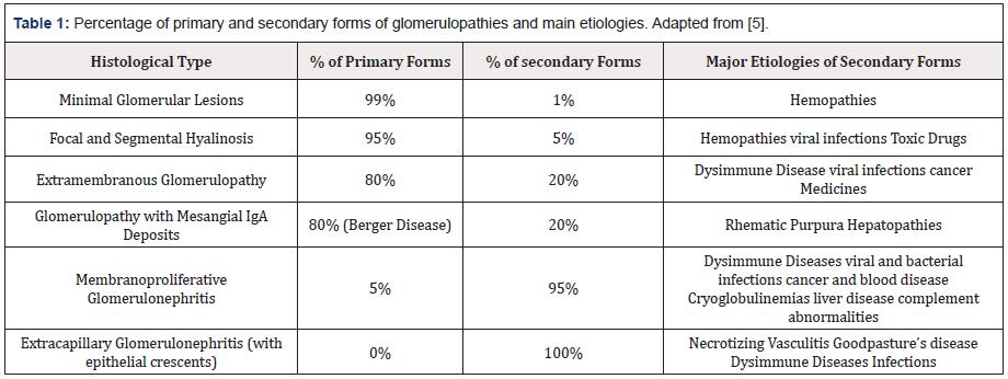 Table 1: Percentage of primary and secondary forms of glomerulopathies and main etiologies. Adapted from [5].