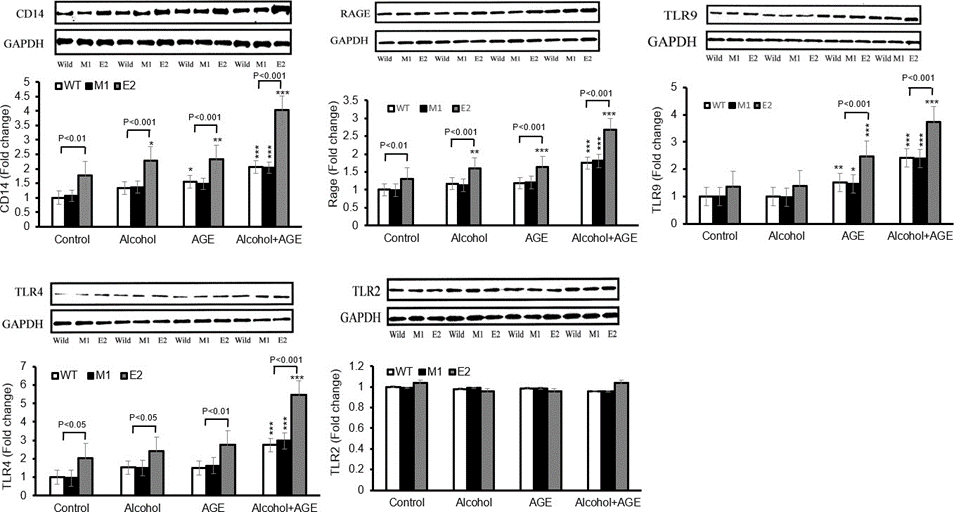 Figure 4: Increased levels of CD14, TLR4, TLR9 and RAGE in CYP2E1-expressing macrophages with alcohol and AGE treatment.