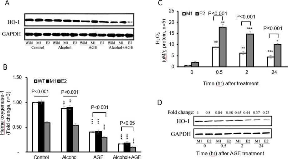 By Western blot analysis, all three group cells were treated with alcohol, AGE and alcohol +AGE for 30 minutes. In the control group, E2 cells showed 41% lower HO-1 protein levels than in the M1(0.59 vs. 1.01, p<0.001) and WT cells (0.59 vs. 1.00, p < 0.001) Figure 5A. No significant difference in HO-1 levels between control and alcohol treatment was found in E2 cells or in both M1 and WT cells.