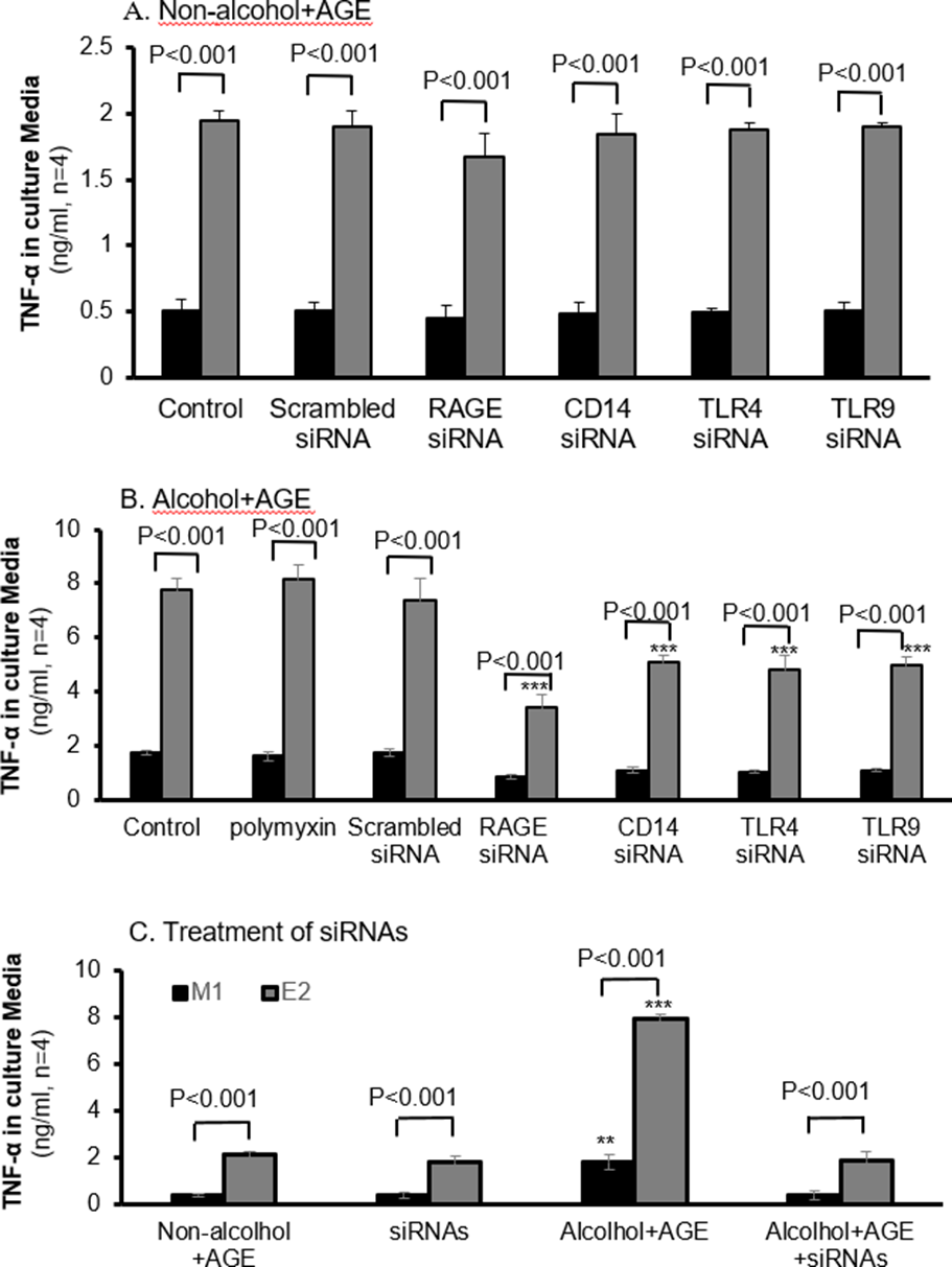 Treatment of alcohol+ AGE in Figure 6B increased about 3.5 times TNF-ɑ protein in E2, compared with M1 macrophages (7786.6 vs.1744.7ng/ml, p< 0.001). Addition of siRNAs of RAGE, CD14, TLR4 and TLR9 partially decreased TNF ɑ by 35-56% compared with its E2 with treatment of alcohol+ AGE, and by 37-52% in M1 cells, respectively. There is no effect of polymyxin and scrambled siRNA on alcohol+ AGE-induced TNF-ɑ generation in both E2 and M1 cells. However, combination treatment of siRNAs of RAGE, CD14, TLR4 and TLR9 completely blocked TNF-ɑ generation by alcohol+ AGEtreated E2 and M1 cells Figure 6C.